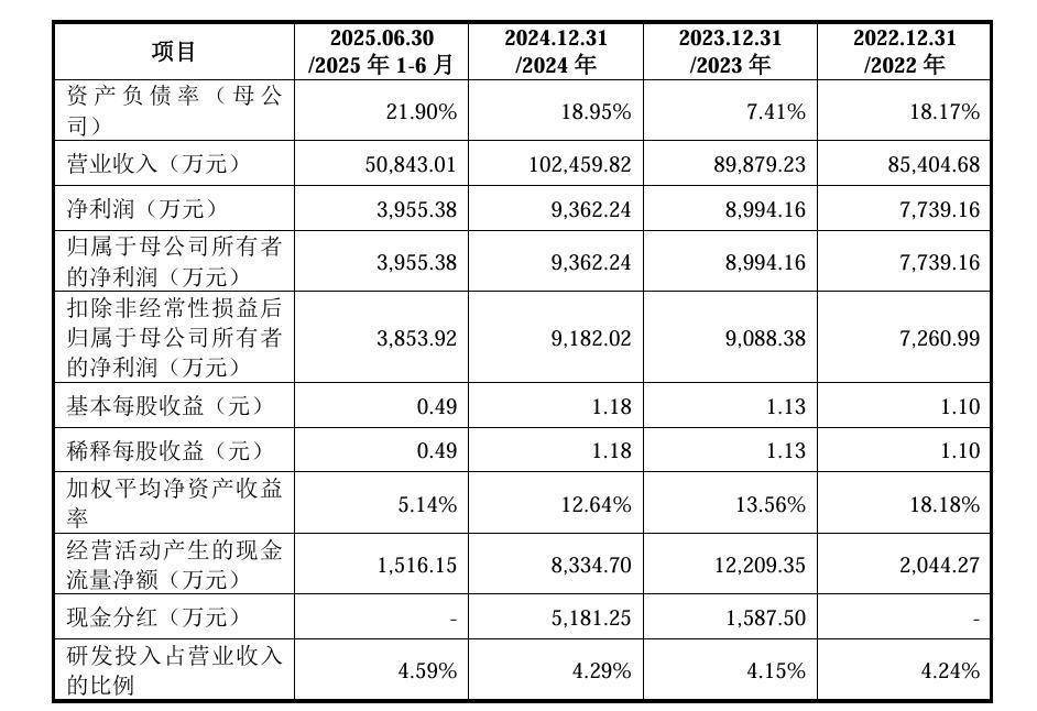 据招股书,报告期(2022年至2024年度、2025年上半年)各期,优邦科技分别实现营收约8.54亿元、8.99亿元、10.25亿元、5.08亿元,归母净利润7739.16万元、8994.16万元、9362.24万元、3955.38万元。
